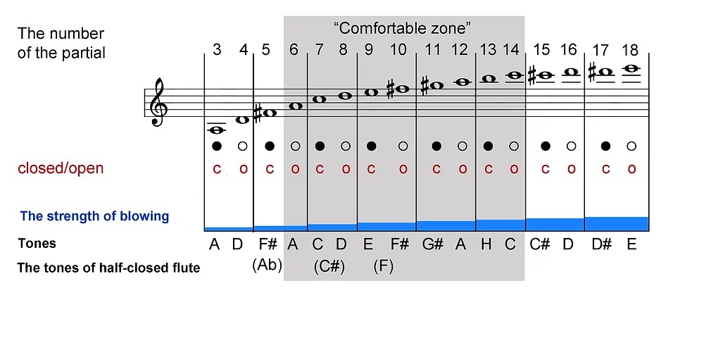 From this site you can find some exercises to help developing your playing technic with overtone flute. All exercises can be found both as music sheets and as audio samples. Note reading skills are not necessary if you listen the audio samples and play D-tuned overtone flute (or if you change sample’s pitch to the key of your flute). I have written all exercises and tunes one octave higher than described in the diagram on page “Overtone flute scale”. In the diagram below the overtone flute scale is represented in the key of D and in the same octave than in the exercises and in the songs. The accidentals of the music sheets are shown in a way that makes it easier to read overtone flute tune notes. Remember that the tuning and intonation of the overtone flute is not the same than e.g. piano’s equal tuning. To keep it clear I have written all tunes by using basic stave, basic notes and basic accidentals. Some of the music sheets are written to overtone flutes with different keys to ensure that they can be comfortably played with chosen flute keys. Some songs may be unpleasantly high for basic D-tunes flute (high D).