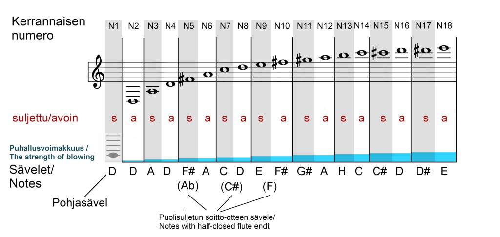 Pitkähuilun asteikko pohjautuu harmoniseen yläsävelsarjaan. Sävelten tarkkaan vireeseen vaikuttavat muun muassa soittimen osien rakenne ja soittajan suuontelon tilavuus. Yläsävelasteikkoa kuulee myös esim. kurkkulaulussa ja munniharpun soitossa. Pitkähuilumelodiat liikkuvat yleensä kahdeksannen yläsävelen (kerrannaisen) paikkeilla. Teoriassa yläsävelsarjan voisi soittaa pelkällä avotekniikalla sulkematta putken päätä, mutta tällöin mm. kahdeksas yläsävel soisi huilussa epämiellyttävän korkealta. Tukkotekniikalla saatavassa asteikossa soi vain joka toinen yläsävel. Tukkotekniikkaa ja avotekniikkaa yhdistelemällä saadaan korvalle miellyttävältä korkeudelta soiva yläsävelasteikko. Asteikkoa voidaan laajentaa entisestään sulkemalla putken pää vain osittain esim. 1/2 tai 3/4.