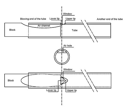 Overtoneflutes can be devided to two different caregories: block flutes and rim-blown flutes. These two types differ with each other how the air travels to the window. Flutes can also be devided by the location of the blowing hole: side-blown and end-blown flutes.